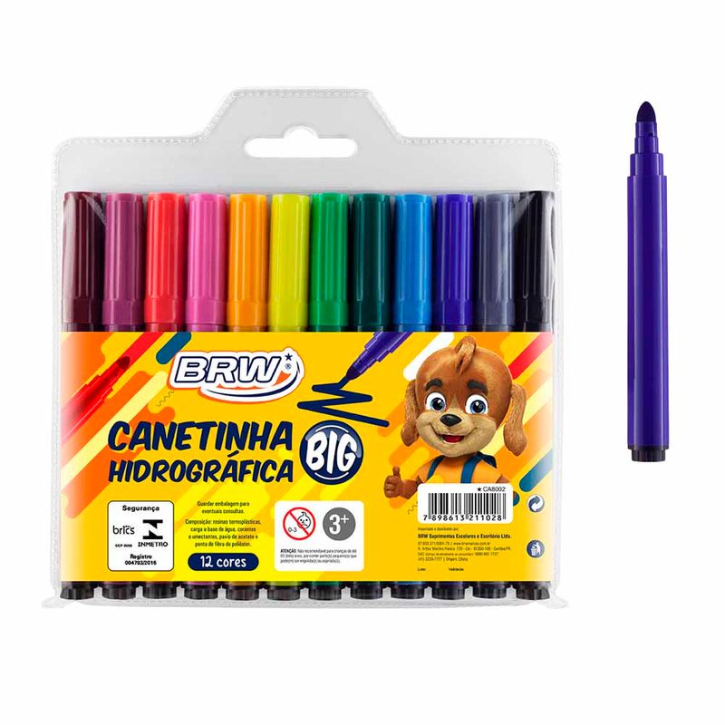 A Caneta Hidrocor com 12 cores Big oferece uma paleta vibrante para desenhos, pinturas e tracejados. Ideal para uso em papel, papel cartão e cartolina, esta canetinha hidrográfica proporciona versatilidade criativa. Além disso, é atóxica e lavável, tornando-a segura para uso, especialmente por crianças. Com uma seleção de cores que inclui Marrom, Roxo, Vermelho, Rosa, Laranja, Amarelo, Verde, Verde Escuro, Azul, Azul Escuro, Cinza e Preto, esta caneta é uma ferramenta essencial para expressar.