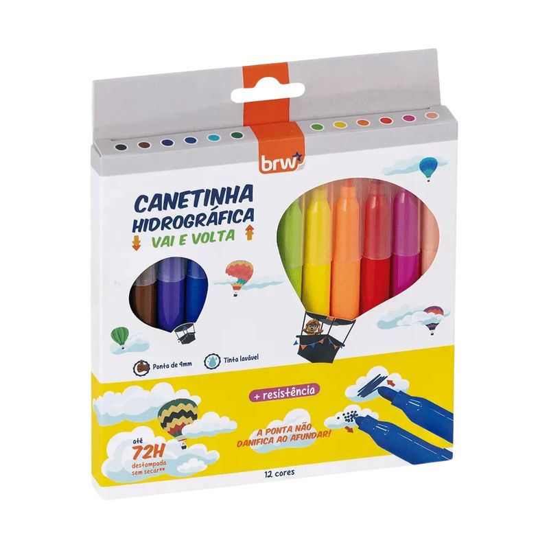 A Caneta Hidrocor Vai e Vem com 12 cores é perfeita para quem busca praticidade e qualidade. Com ponta resistente de 4mm e grip triangular, ela oferece conforto e precisão na escrita e nos desenhos. Sua tinta lavável garante facilidade na limpeza, e a fórmula não tóxica é ideal para todas as idades. Pode ficar destampada por até 72 horas em locais arejados sem secar, oferecendo mais resistência e durabilidade.